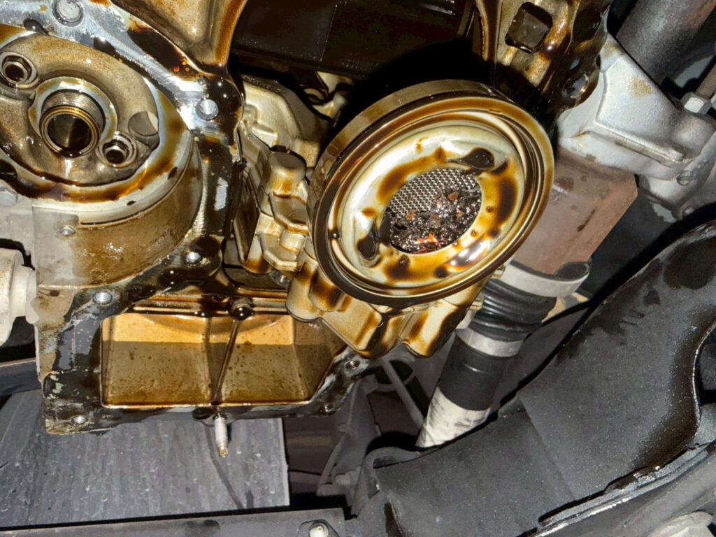 エンジン内部に溜まった「スラッジ(オイルの燃えカスや汚れの塊)」が、オイルを吸い上げるストレーナーを塞いでしまっていました。