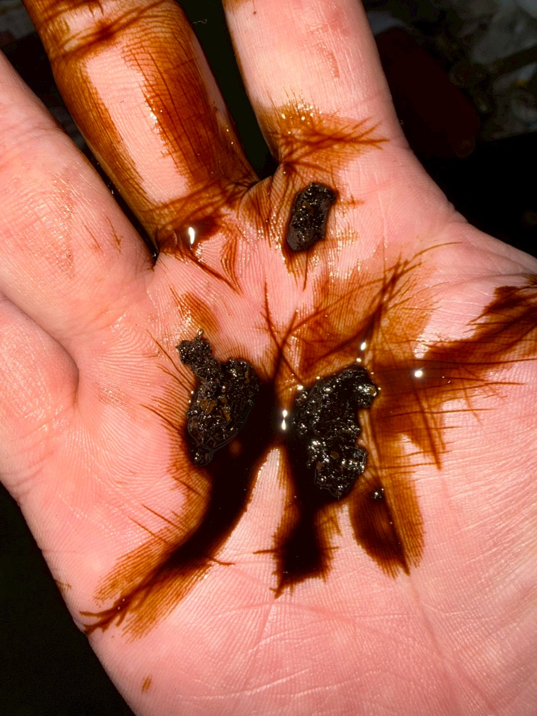 こちらの写真をご覧ください。手のひらに乗っているのが、内部から取り出したスラッジの塊です。